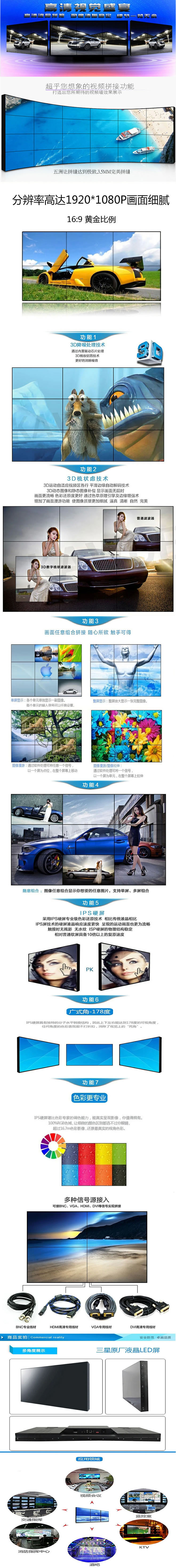 1:內置拼接技術。2:支持隨機數生成地址碼,調屏更方便。3:自動智能溫控系統,4:標準機柜安裝結構,標準化、模塊化可實現快速拼接安裝。5:鈑金外殼,工業級零部件,散熱更換,堅固耐用,使用壽命長達80000小時。6:自動開關機管理功能,內置時鐘設置,自定義設置自動開關機時間7:色彩自動調節,精準采集畫面數據,保證拼接屏色彩亮度輸出一致。8:支持畫面校正功能,支持拼接畫面錯位補償功能。9:低功耗長壽命支持7*24小時開機。10:超級好屏,雙向180度全視角,無視差,滿足全方位舒適觀賞。11:包裝給力,運輸安全,結實抗摔抗壓,承重大。12:隨心無縫拼接,無論多大空間顯示,五洲視界拼接屏都能無縫鏈接展現完美商業顯示方案。13:圖像180度旋轉功能。
