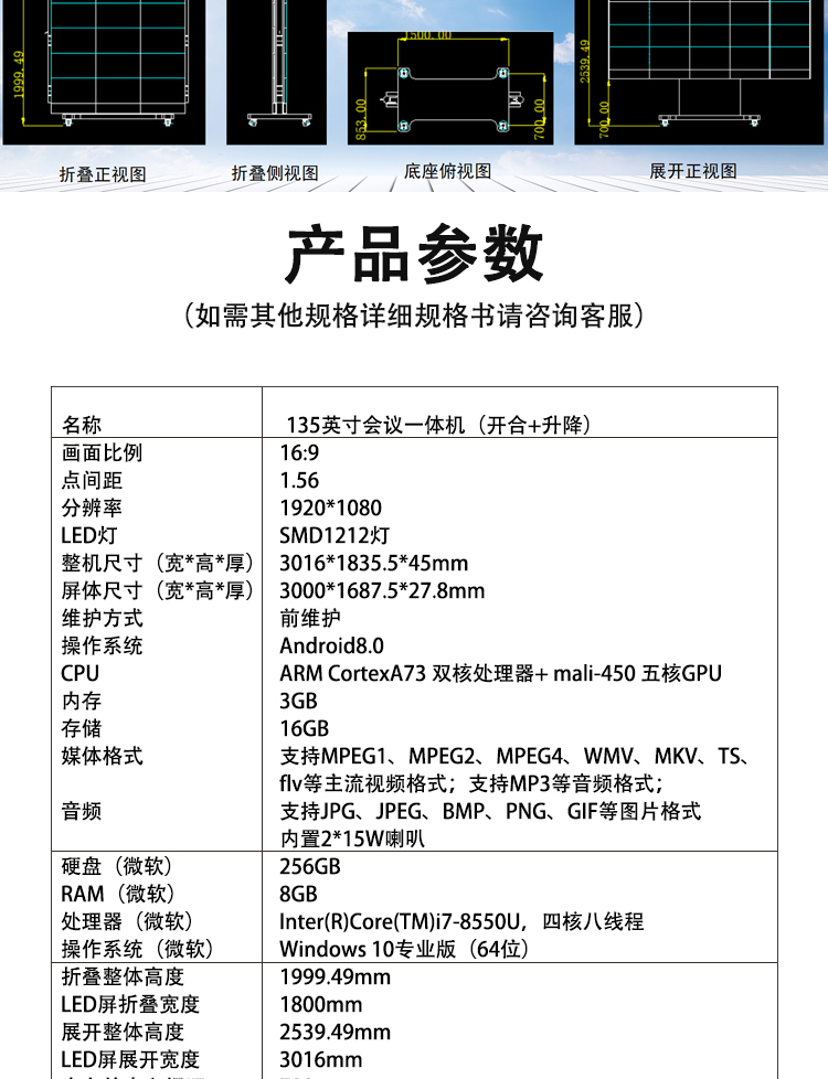 • 135寸自動升降折疊式LED全彩顯示屏COB電子板報宣傳欄室內(nèi)小間距視頻會議終端大屏